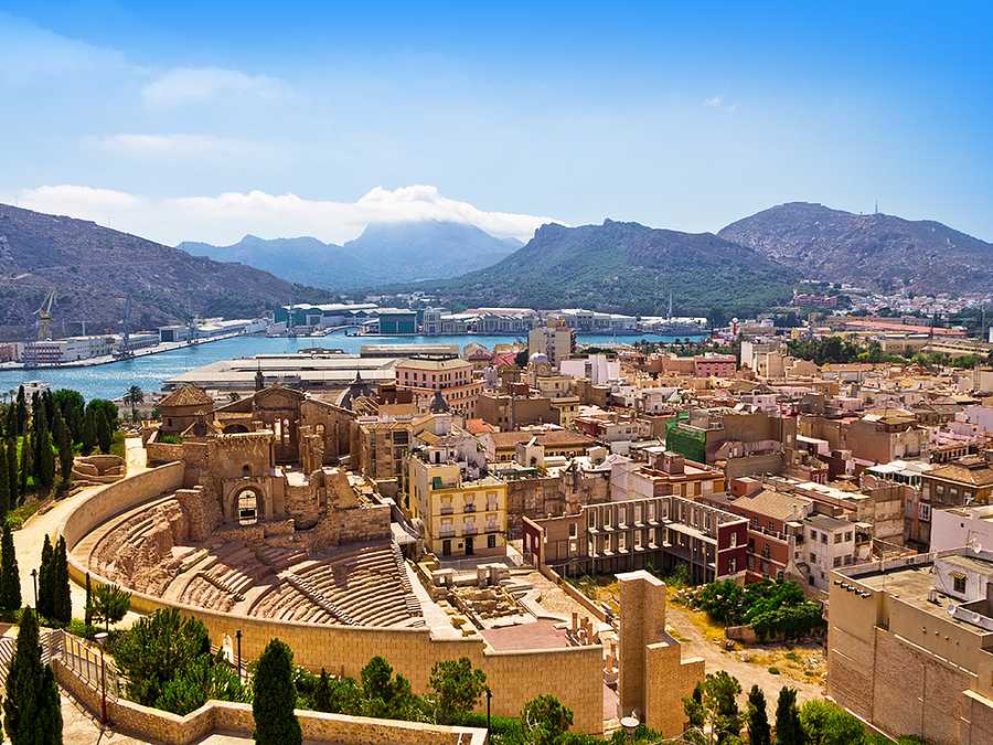 Cartagena is a port city and naval base in the Murcia region of southeast Spain. Founded by the Carthaginians around 220 B.C., the city boomed during the Roman period. Among its many Roman ruins are a 1st-century B.C. theater and Casa de la Fortuna, a villa with murals and mosaics. The Muralla Púnica (Punic Wall) interpretation center houses the remains of a 3rd-century B.C. defensive wall.