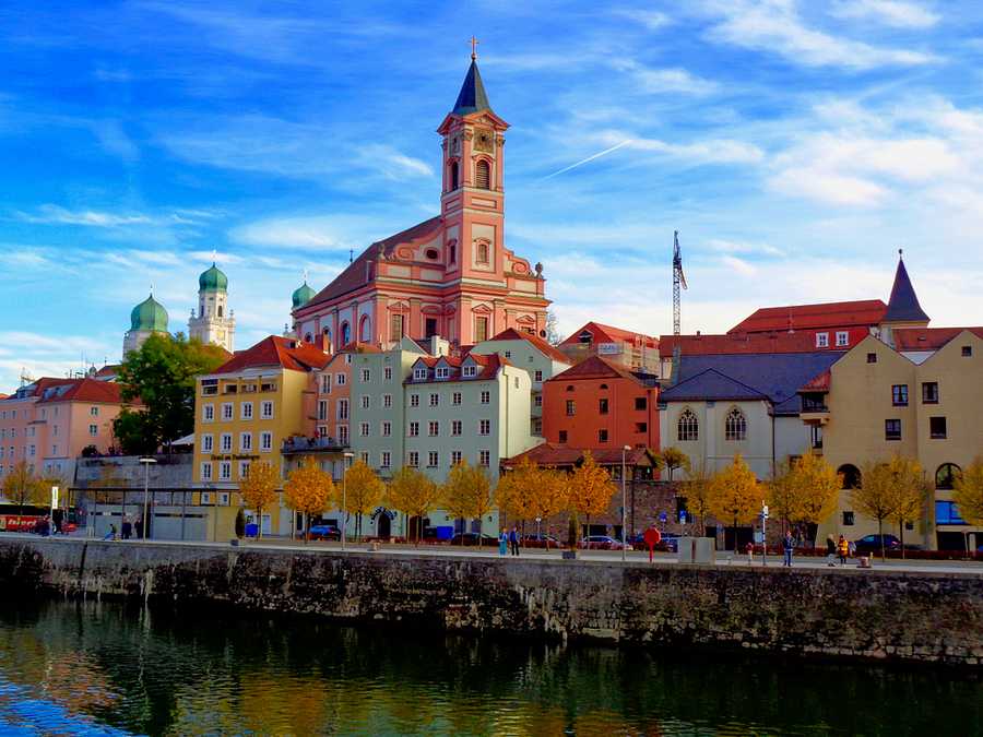 Passau, a German city on the Austrian border, lies at the confluence of the Danube, Inn and Ilz rivers. Known as the Three Rivers City, it's overlooked by the Veste Oberhaus, a 13th-century hilltop fortress housing a city museum and observation tower. The old town below is known for its baroque architecture, including St. Stephen's Cathedral, featuring distinctive onion-domed towers and an organ with 17,974 pipes.
