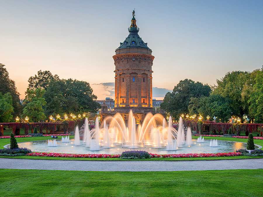 Mannheim is a city in southwest Germany, on the Rhine and Neckar rivers. The baroque 18th-century Mannheim Palace houses historical exhibits, plus the University of Mannheim. In the grid-like center, called the Quadrate, Marktplatz Square features a baroque fountain with statues. Planken shopping street leads southeast to the Romanesque Water Tower, in the art nouveau gardens of Friedrichsplatz.