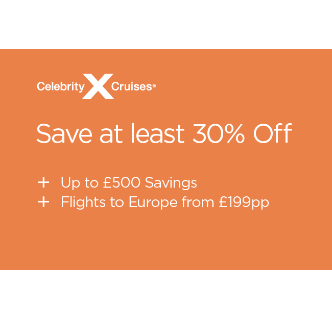 With Celebrity Cruises' newest promotion, you can Save at Least 30%^ plus Additional Savings of up to £400 per couple^^. And that's not all, you can also enjoy Flights from £199pp to Europe^^^.
